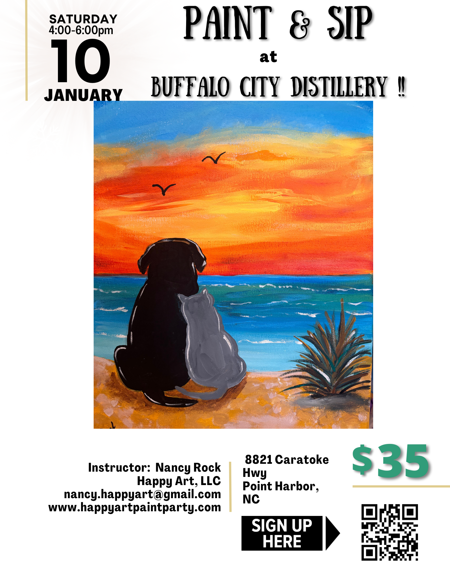 We’ll be painting “Beach Buddies,” a cheerful seaside sunset featuring a loyal dog and cozy cat gazing out over the ocean. This easy, step-by-step painting class is perfect for beginners and all animal lovers alike!